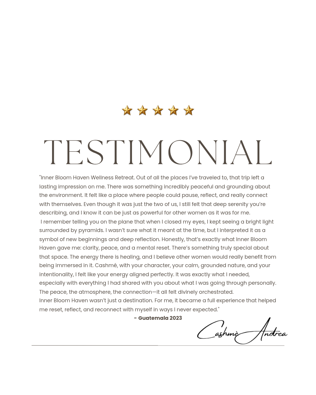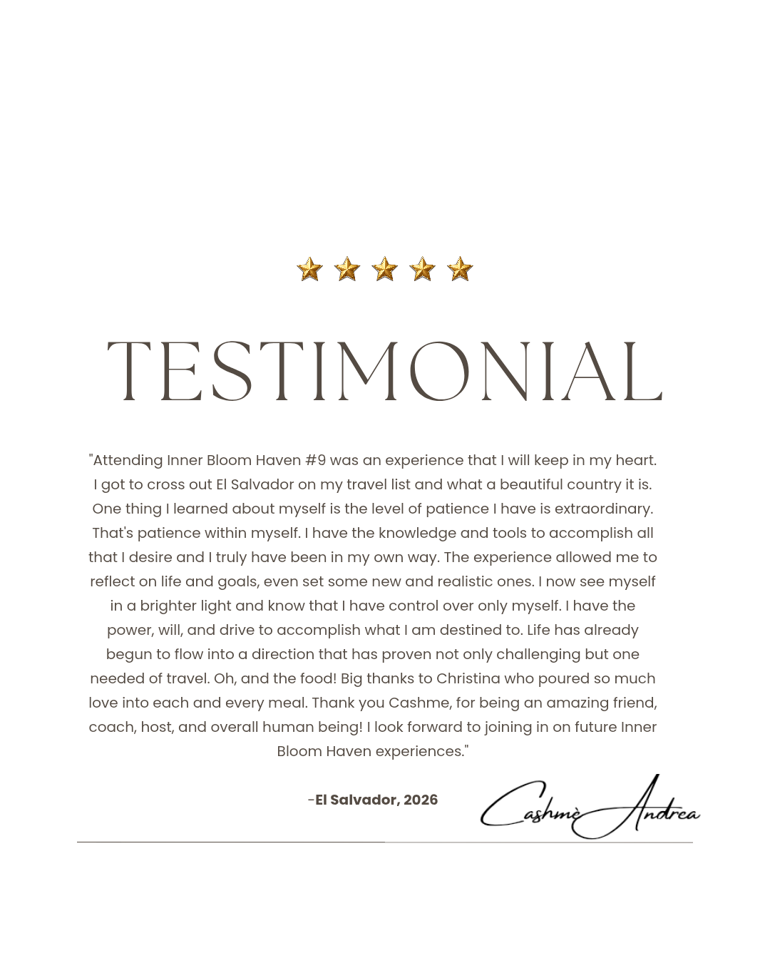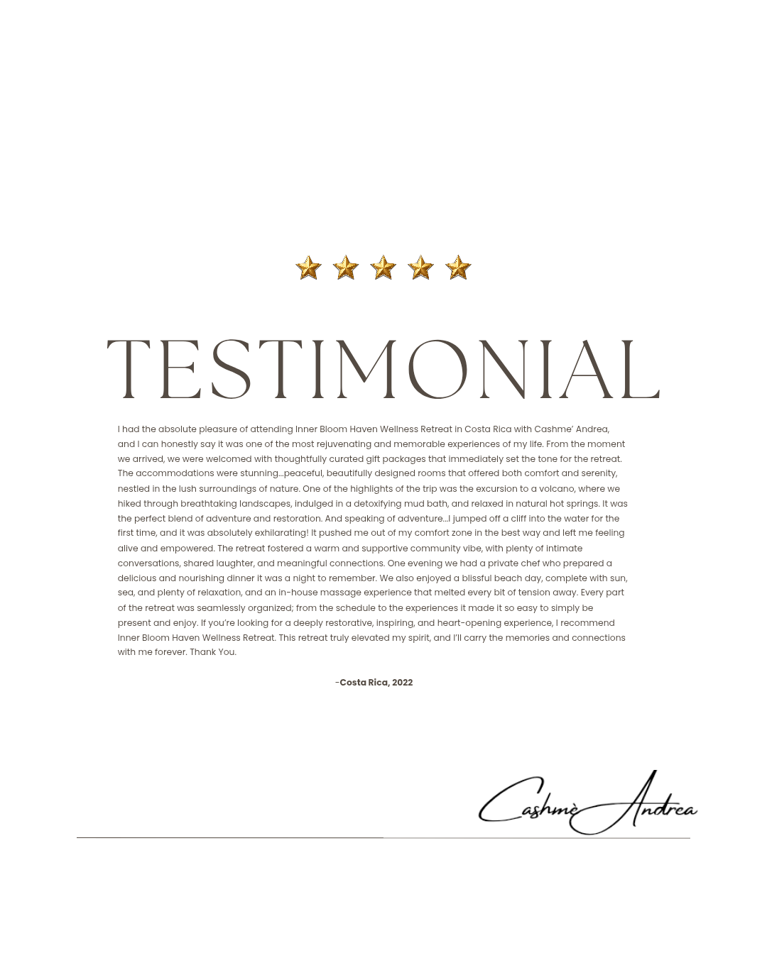 "I had the absolute pleasure of attending Inner Bloom Haven Wellness Retreat in Costa Rica with Cashme’ Andrea, and I can honestly say it was one of the most rejuvenating and memorable experiences of my life.