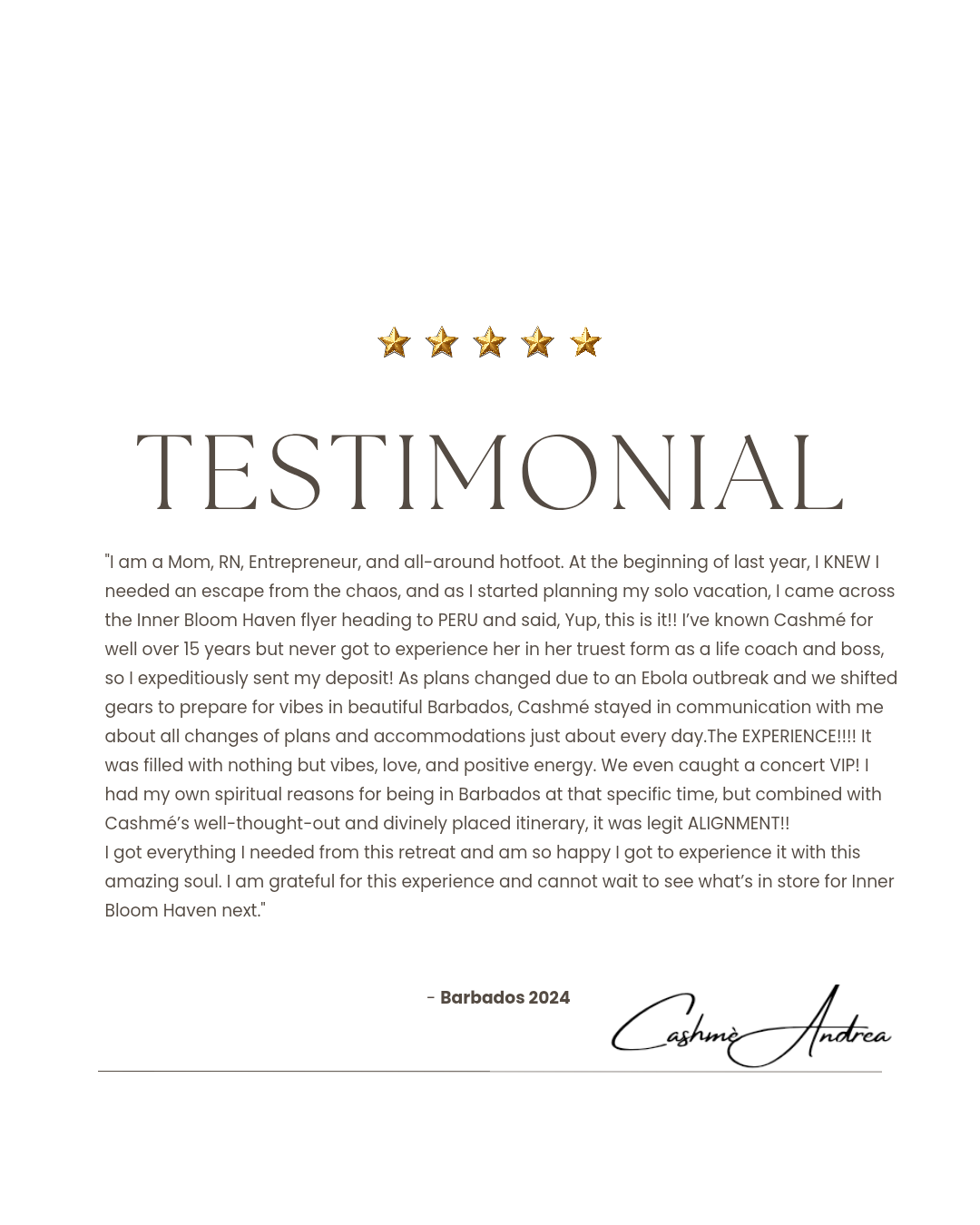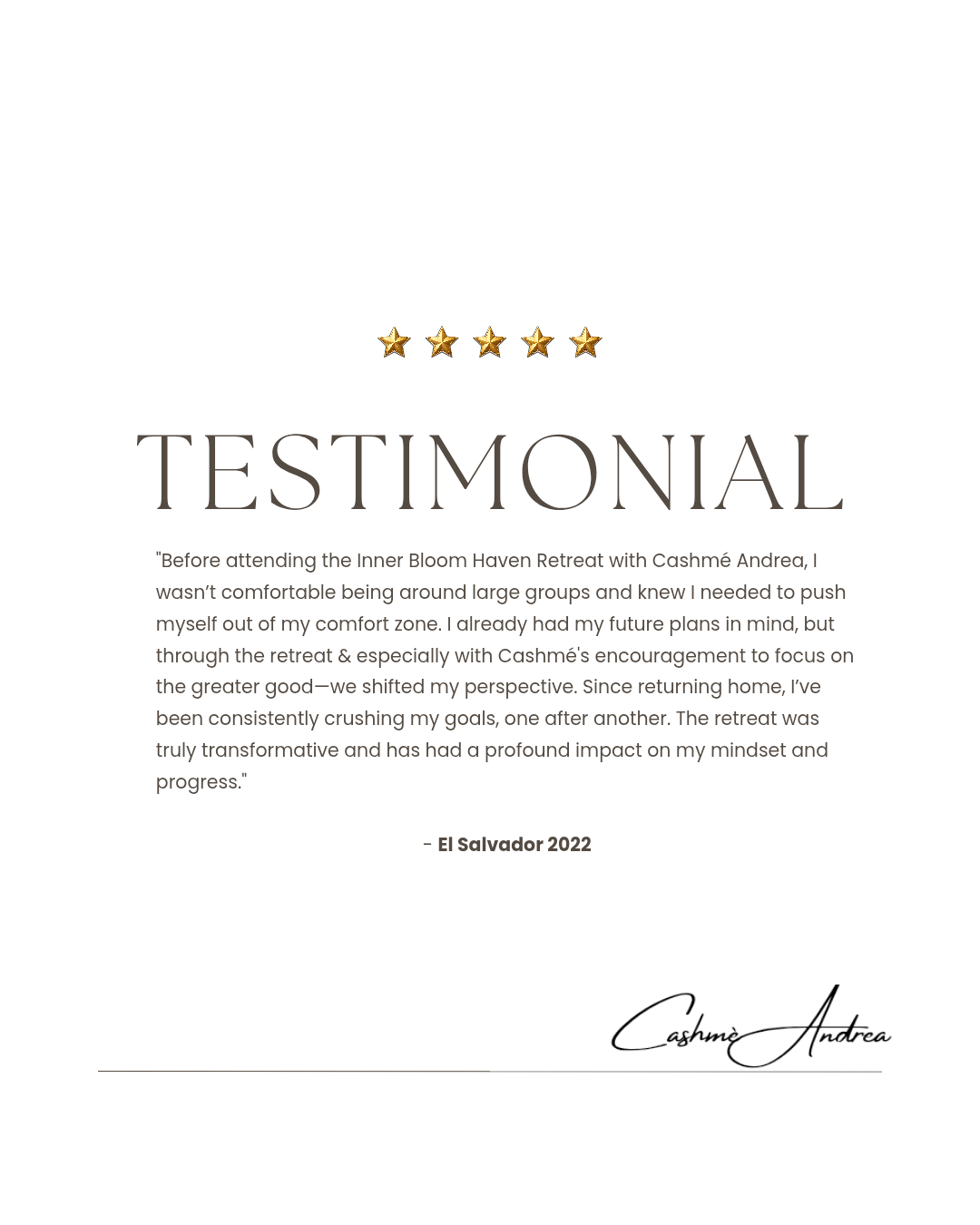 "Before attending the Inner Bloom Haven Retreat with Cashmé Andrea, I wasn’t comfortable being around large groups and knew I needed to push myself out of my comfort zone. I already had my future plans in mind, but through the retreat & especially with Cashmé's encouragement to focus on the greater good—we shifted my perspective. Since returning home, I’ve been consistently crushing my goals, one after another. The retreat was truly transformative and has had a profound impact on my mindset and progress."