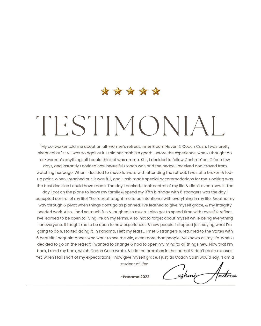 “My co-worker told me about an all-women’s retreat, Inner Bloom Haven & Coach Cash. I was pretty skeptical at 1st & I was so against it. I told her, “nah I’m good”. Before the experience, when I thought an all-women’s anything, all I could think of was drama. Still, I decided to follow Cashme’ on IG for a few days, and instantly I noticed how beautiful Coach was and the peace I received and craved from watching her page. When I decided to move forward with attending the retreat, I was at a broken & fed-up point. When I reached out, it was full, and Cash made special accommodations for me. Booking was the best decision I could have made. The day I booked, I took control of my life & didn’t even know it. The day I got on the plane to leave my family & spend my 37th birthday with 6 strangers was the day I accepted control of my life! The retreat taught me to be intentional with everything in my life. Breathe my way through & pivot when things don’t go as planned. I’ve learned to give myself grace, & my integrity needed work. Also, I had so much fun & laughed so much. I also got to spend time with myself & reflect. I’ve learned to be open to living life on my terms. Also, not to forget about myself while being everything for everyone. It taught me to be open to new experiences & new people. I stopped just saying what I’m going to do & started doing it. In Panama, I left my fears… I met 6 strangers & returned to the States with 6 beautiful acquaintances who want to see me win, even more than people I've known all my life. When I decided to go on the retreat, I wanted to change & had to open my mind to all things new. Now that I’m back, I read my book, which Coach Cash wrote, & I do the exercises in the journal & don’t make excuses. Yet, when I fall short of my expectations, I now give myself grace. I just, as Coach Cash would say, “I am a student of life!”